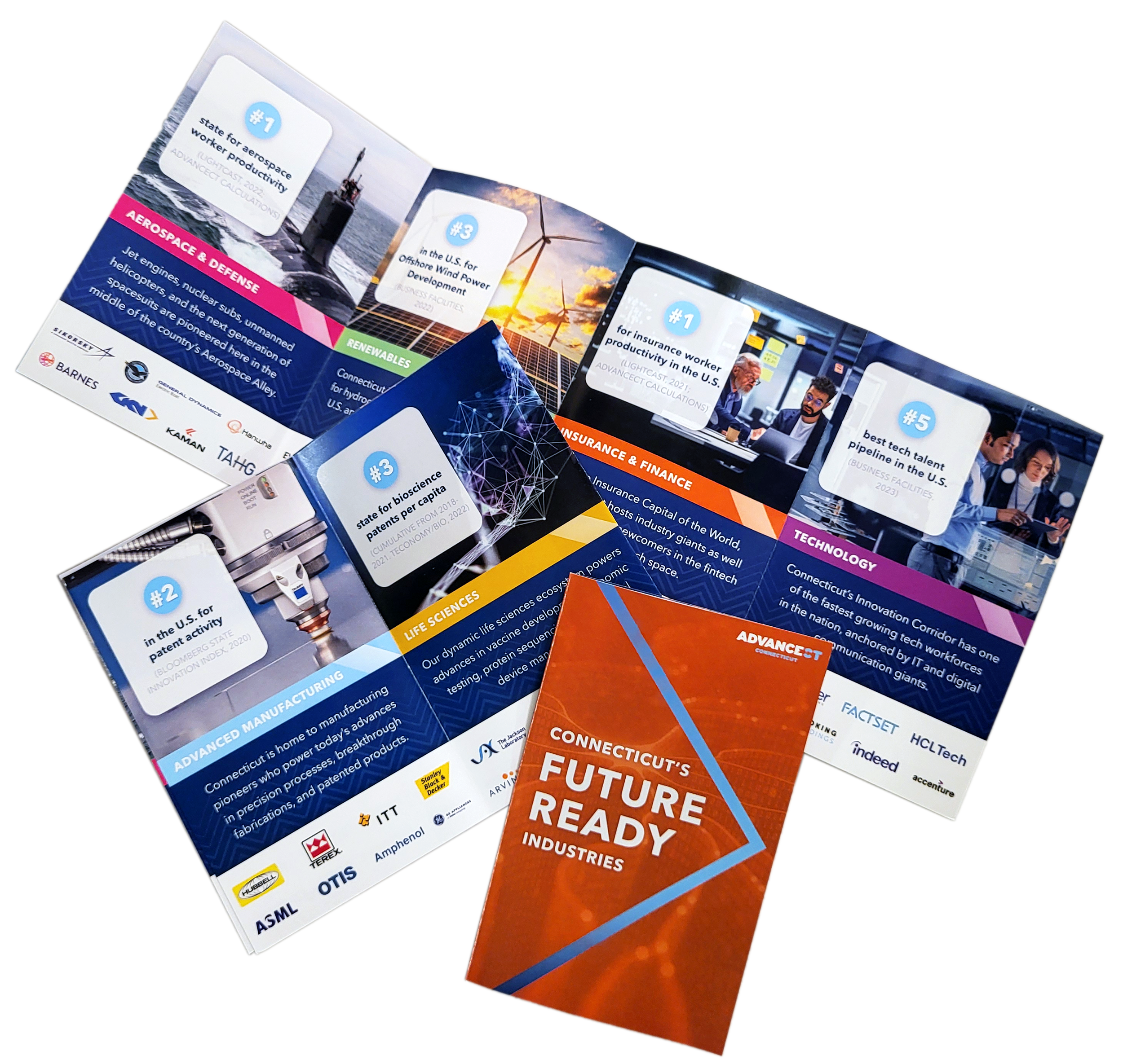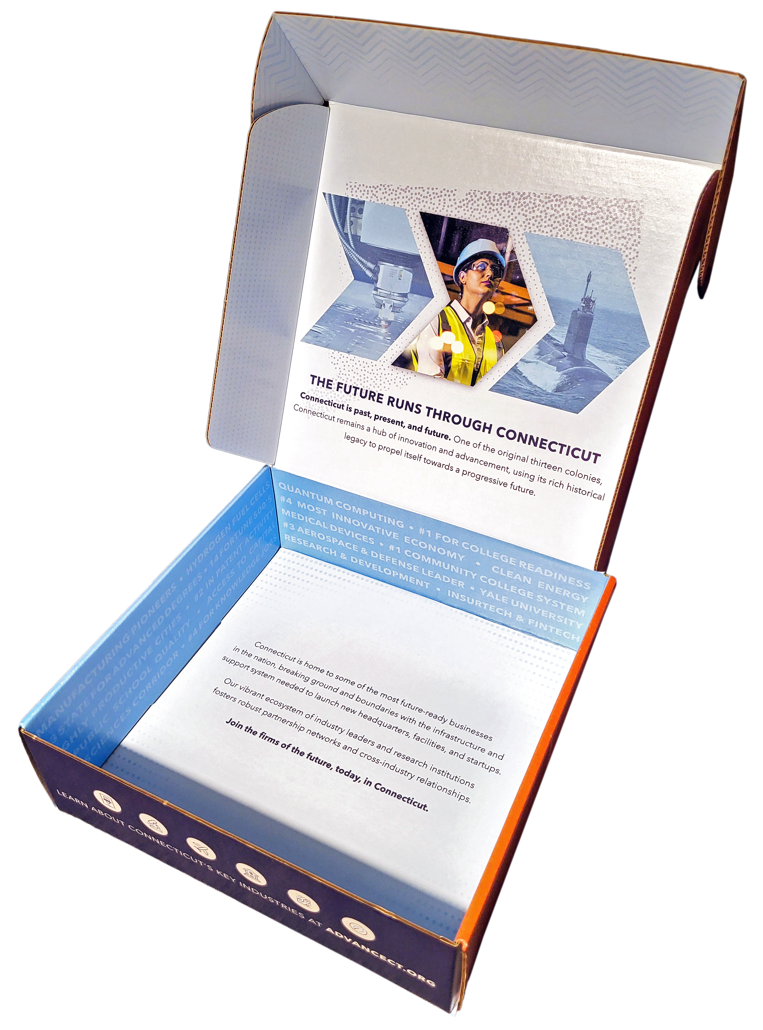 Advancements in science and medicine, promising graduates who feed the local educated workforce, and revolutionary aerospace inventions are testaments of how Connecticut makes the future possible. AdvanceCT’s latest marketing campaign included a trio of postcards, social media and print ads, and customized box mailers. The hero design amplified locally-based Collins Aerospace’s contract with NASA for developing their spacesuits, framed in chevrons to emphasize forward motion in time and technology.