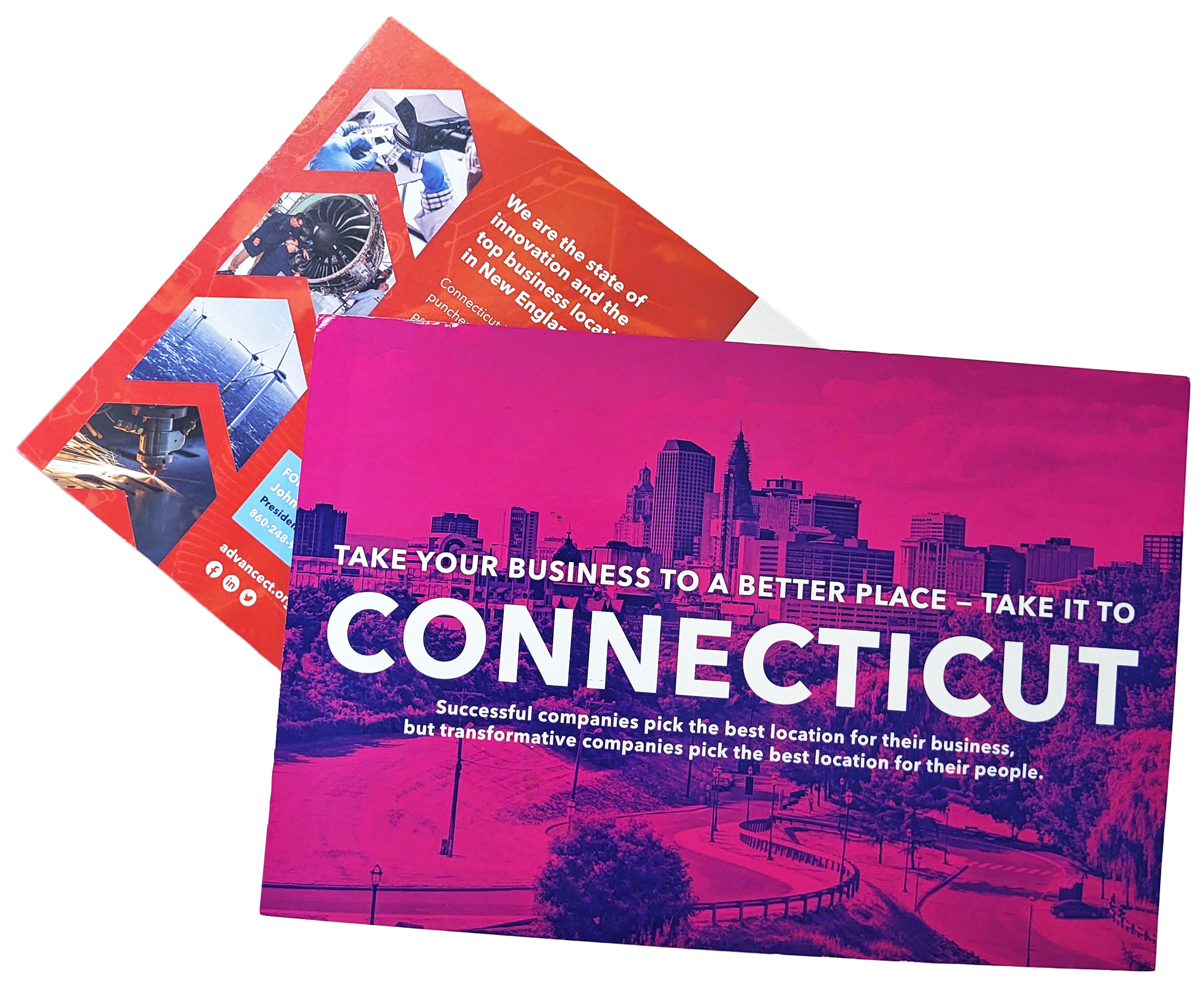 The “Take Your Business to a Better Place” campaign revolved around the use of vibrant colors and surprising contrast to seize attention and make a strong claim about Connecticut’s business environment. The front of the postcards deliver a simple, digestible message while the narrative on the back dives into sector specific anecdotes about Connecticut’s role in vaccine development and the vigorous defense industry.